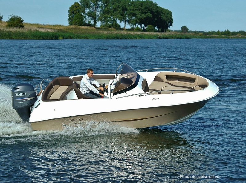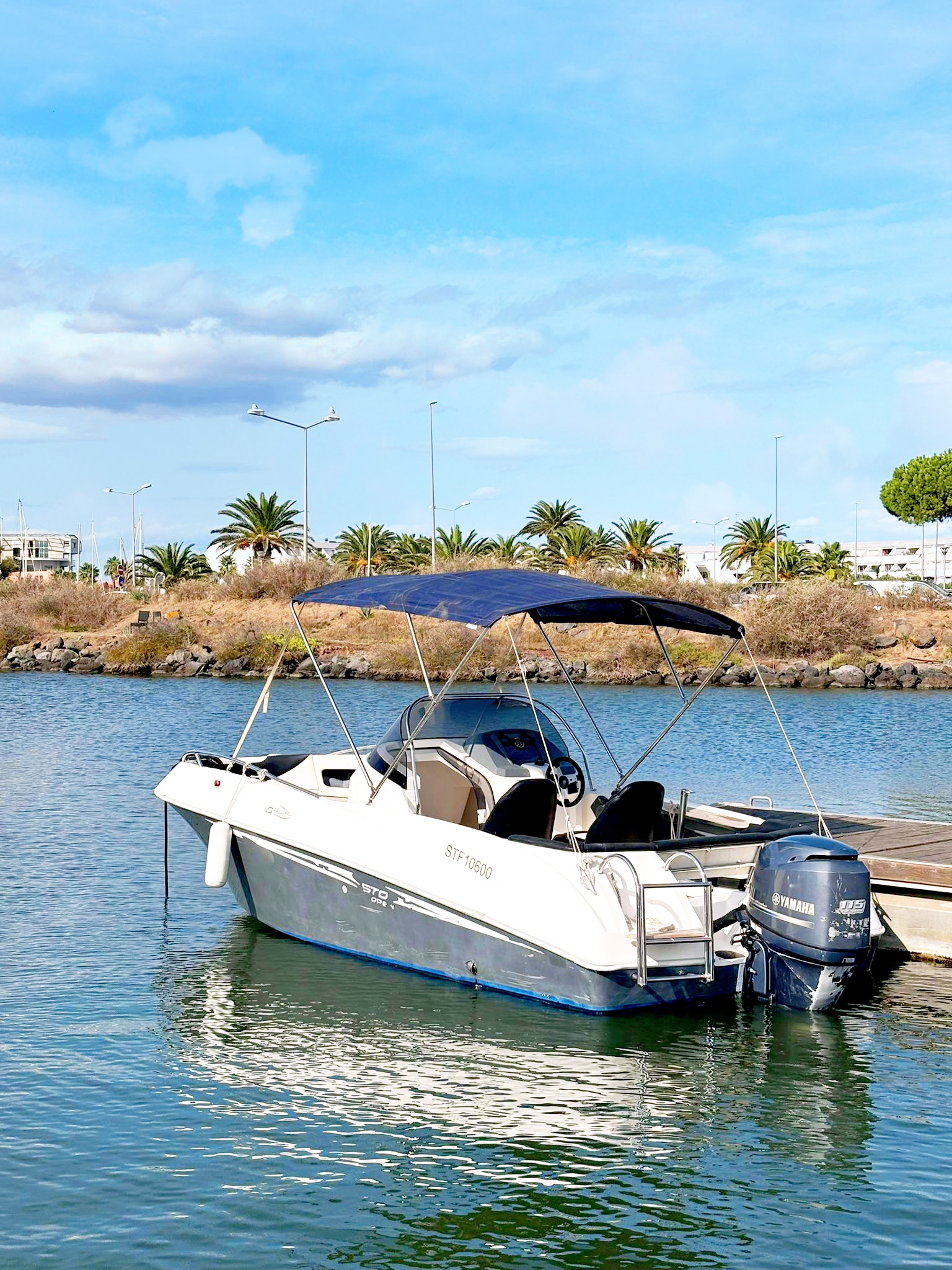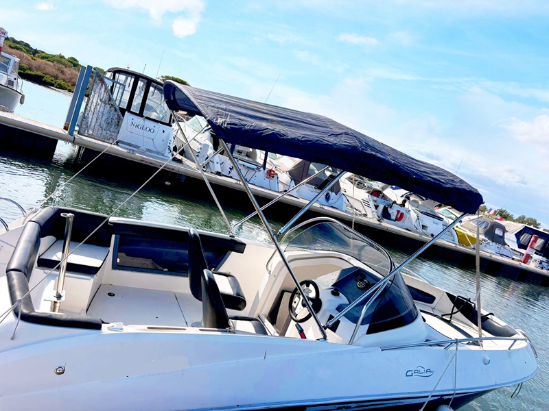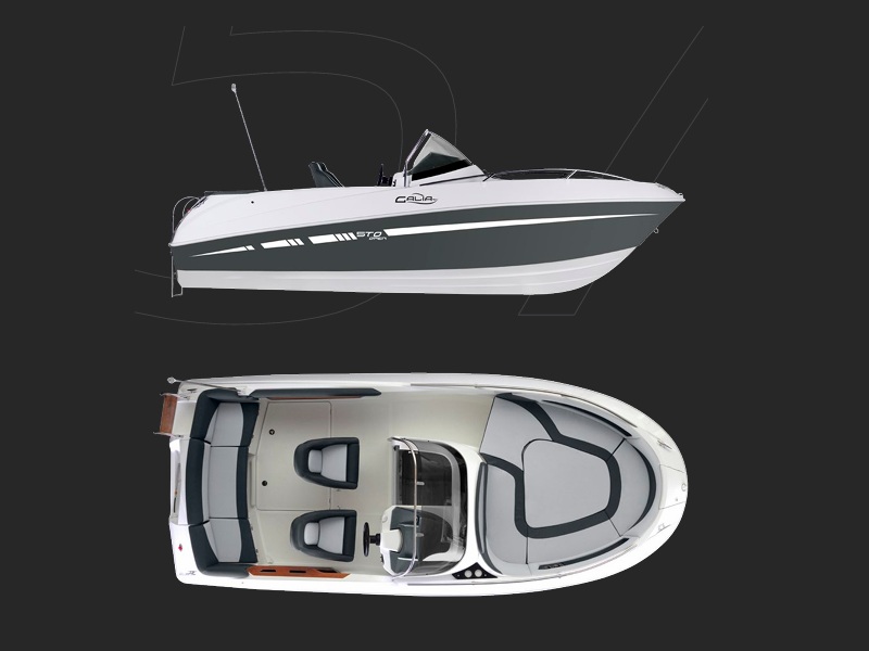 Galia 570 Open. Bateau à moteur de moins de 6 mètres pouvant accueillir jusqu’à 8 passagers. Deux sièges de sport et un banc à l’arrière occupent le cockpit protégé par le pare-brise. Avec un bain de soleil pouvant également être transformé en table, vous pourrez profiter d’un confort digne d’un 8 mètres. La cabine compacte peut être équipée d’un toilettes et pourra stocker du matériel supplémentaire. Une excellente maniabilité et un pont spacieux sont des éléments essentiels de ce modèle. Equipé d’un bimini et d’un mât de ski, il sera idéal pour des sorties sportives wakeboard, bouée tractée, ski nautique… (notamment avec son moteur 115 CV), de pêche ou de détente en mer.