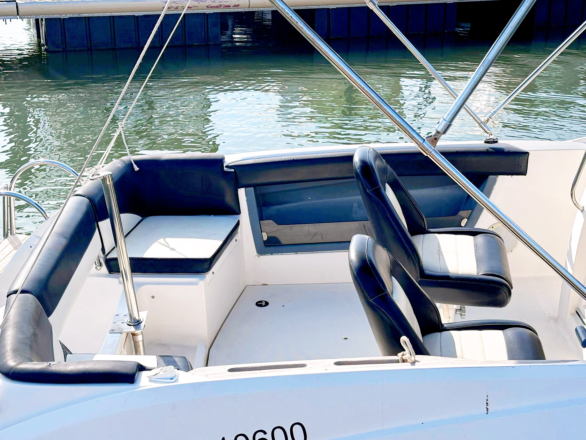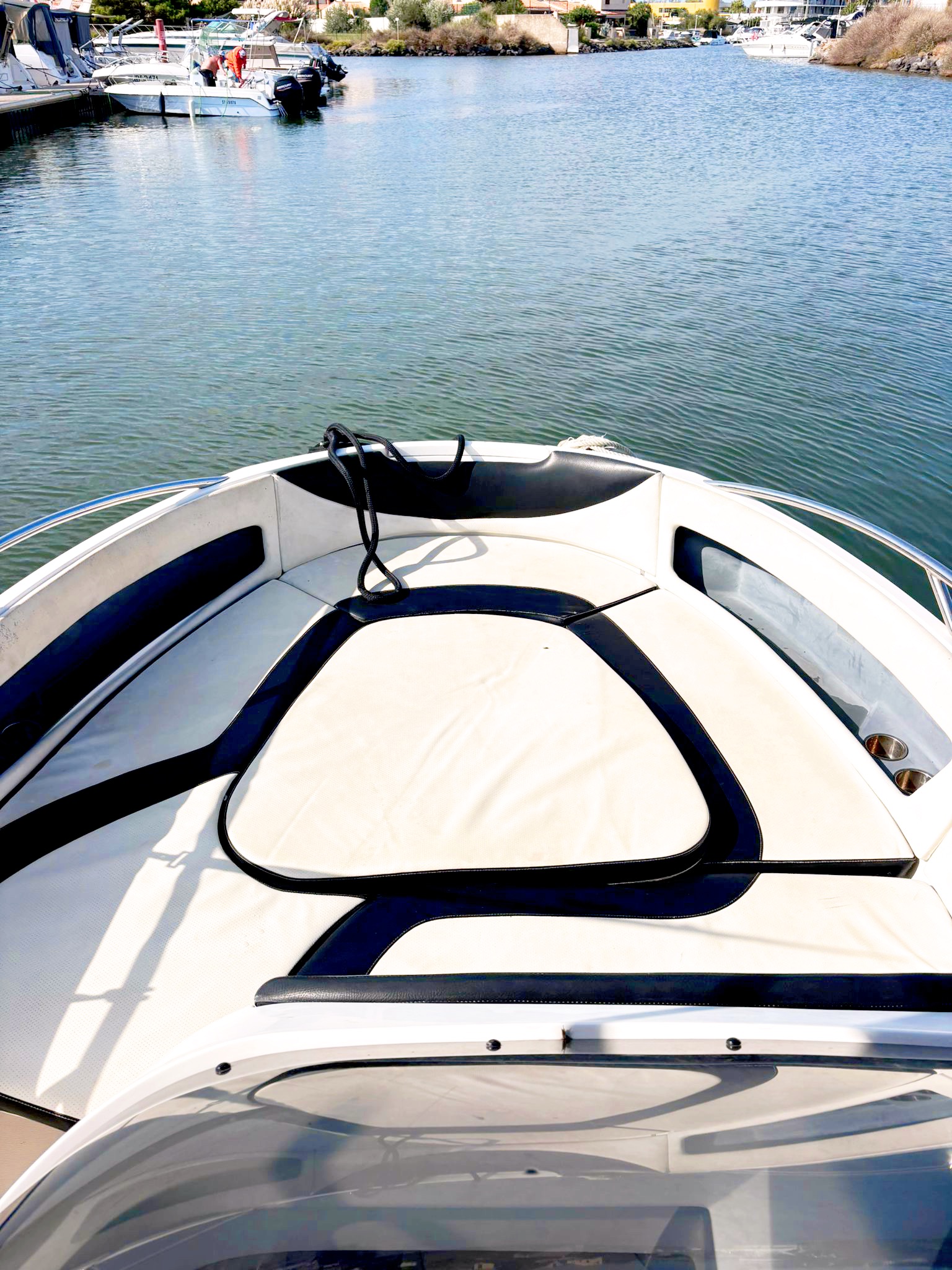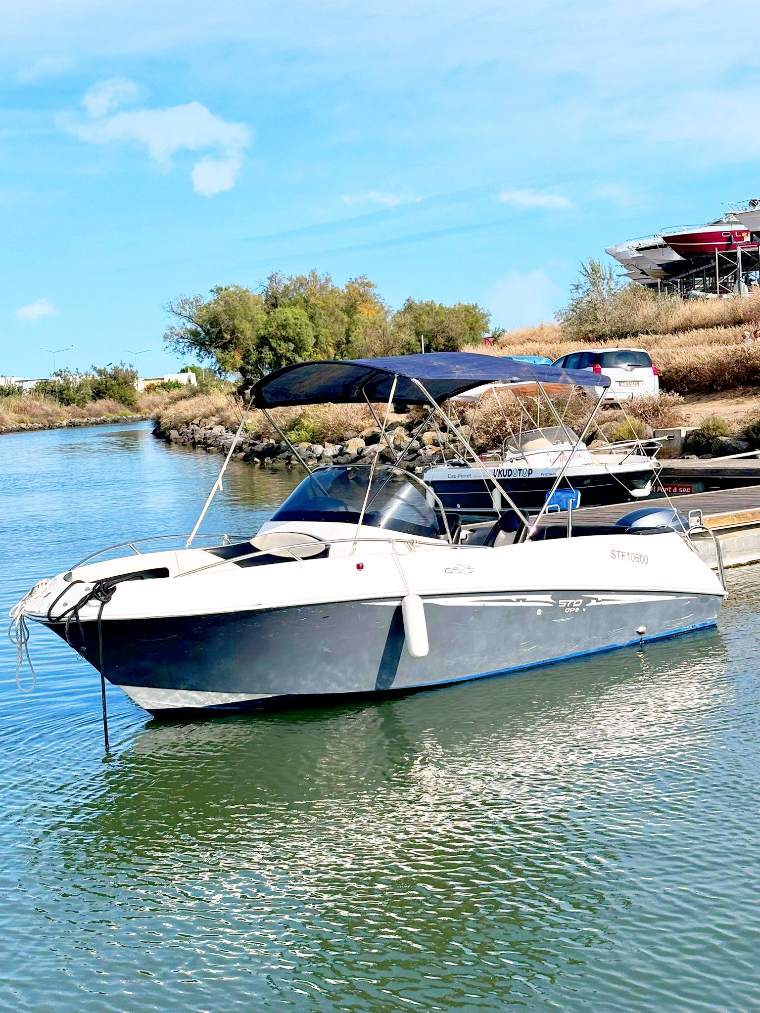 Galia 570 Open. Bateau à moteur de moins de 6 mètres pouvant accueillir jusqu’à 8 passagers. Deux sièges de sport et un banc à l’arrière occupent le cockpit protégé par le pare-brise. Avec un bain de soleil pouvant également être transformé en table, vous pourrez profiter d’un confort digne d’un 8 mètres. La cabine compacte peut être équipée d’un toilettes et pourra stocker du matériel supplémentaire. Une excellente maniabilité et un pont spacieux sont des éléments essentiels de ce modèle. Equipé d’un bimini et d’un mât de ski, il sera idéal pour des sorties sportives wakeboard, bouée tractée, ski nautique… (notamment avec son moteur 115 CV), de pêche ou de détente en mer.